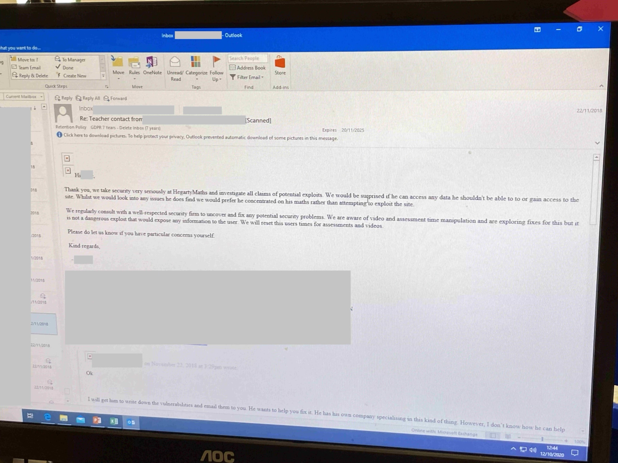 After this, we got in contact with our Math teacher in November of 2018 and got her to send an email to HegartyMaths informing them of our petty exploit and they got back to us very quickly. I don't have the original email anymore but I distinctly remember it saying something along the lines of "Stop trying to hack our platform and get back to doing your homework." Edit: While writing this, I was able to uncover the deleted email from a photo we had taken of it in 2020. See below (certain details redacted for obvious reasons):